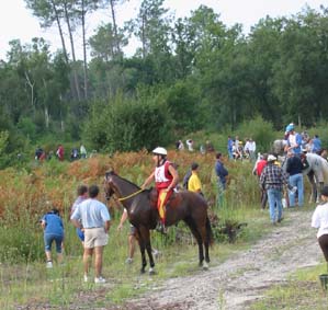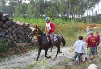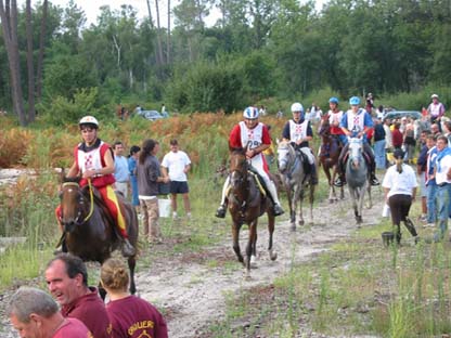 qualité du sol, tout du moins en majeure partie. Le site d'accueil de tous les Vet gates, n'a bénéficié d'une Sono que pour l'arrivée, c'est dans le silence le plus total que se sont déroulés tous les controles.Je crois que depuis Montcuq 2002 c'est la première nationale à laquelle nous assistons où il n'y a pas d'animation. Le fait que plusieurs chevaux venus seulement pour se présenter à l'entraineur national se soient arrêtés volontairement au kilomètre 100 rendait la course un peu bizarre à suivre, enlevant le coté "compétition" qu'il y a sur toutes les autres nationales. Mais avant tout ce qui est de toute façon très regrettable c'est que cette épreuve , qui pourrait être une bonne course, n'était pas inscrite au calendrier 2003,( en tout cas pas à ma connaissance et pas à la connaissances de nombreux autres cavaliers), et sa localisation à 15 jours de Moulins engilbert , à 3 jours de Landivisiau,à 3 jours du championnat de France des jeunes et à 15 jours de Compiègne a certainement privé ces nationales qui étaient inscrites au calendrier , de plusieurs de leurs potentiels participants . De toute évidence , il y a une demande pour ce type de course plate (sur du bon terrain) car malgré son annonce tardive , la proximité des autres nationales et le manque d'information ( de très nombreux cavaliers n'étaient pas au courant de l'existence de cette course et auraient aimé s'y inscrire) les cavaliers avaient répondus présents. C'est un gros travail que d'organiser une