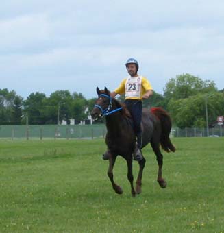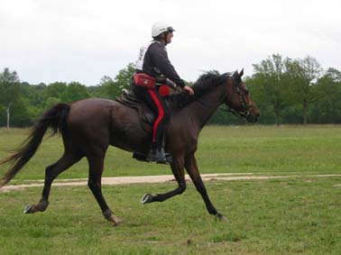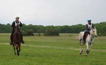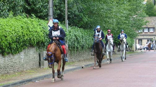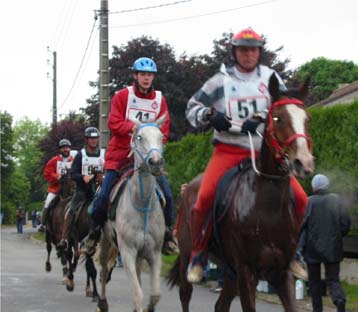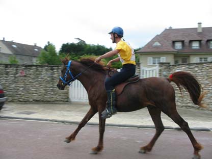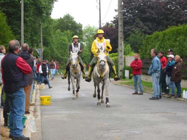 ![]() Eldair de Cabirat et Jean Noel Lafaure, partis 7 minutes devant leurs plus proches poursuivants, voient leur avance se réduire au fur et à mesure de l'étape. Seuls, ils parviennent néanmoins à ne pas se faire rattraper avant l'hippodrome , alors que 12kms plus tôt leur avance n'était plus que d'1mn 30. |